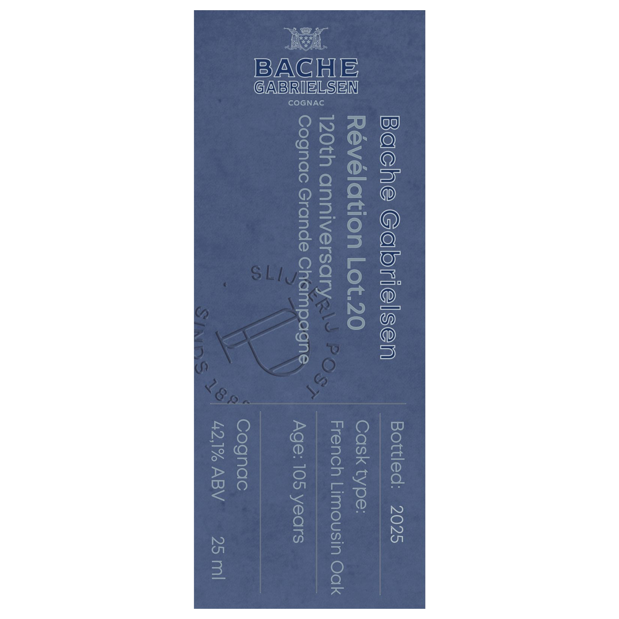 De Bache Gabrielsen La Revelation Lot 20 is een zeldzame Grande Champagne cognac van Bache Gabrielsen die gebotteld is ter ere van de 120e verjaardag van het cognac huis. Lot 20 is een 105 jaar oude cognac uit 1920 afkomstig van een single lot uit het Bouteville gebied. De geschiedenis van deze release is net zo opmerkelijk als de smaak. Tijdens de Tweede Wereldoorlog werd het verborgen in een privéwoning, achter valse muren, om het behoud ervan te garanderen